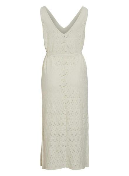 Vestido Vila. Color beige. Cuello en V. Sin mangas. Largo midi. Tejido de punto perforado. Con elástico. Cinturón ajustable en la cintura. Espalda en V. Aberura lateral.