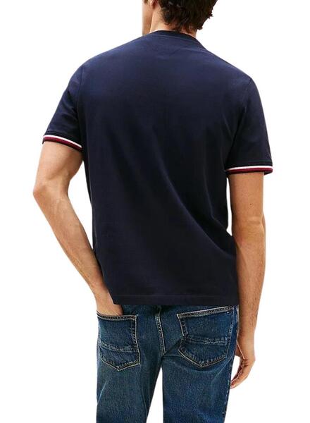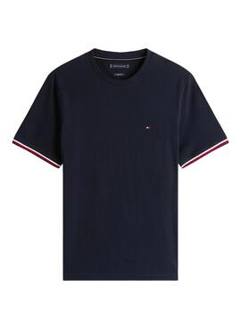 Camiseta Tommy Hilfiger. Modelo Global Stripe. Color azul marino. Cuello redondo. Ajuste regular. Manga corta. Extremos de manga con banda en rojo y blanco.