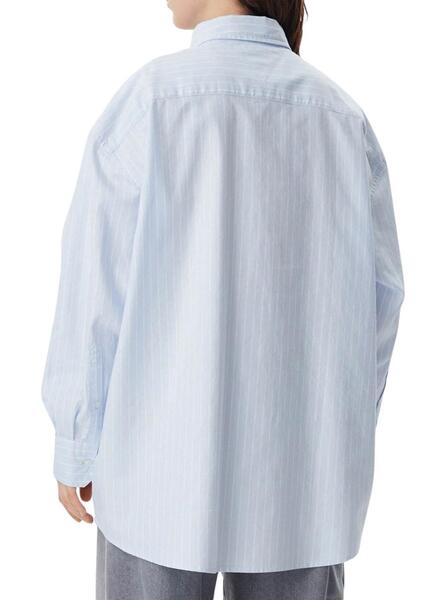 Camisa Tommy Jeans. Modelo Badge. Color azul y blanco. Estampado con rayas verticales. Manga larga. Cierre de botones. Bolsillo con la bandera de la marca en el pecho. Hombros caídos. Corte oversize