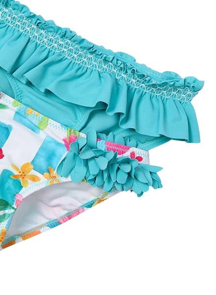Pack 2 Culetines Mayoral. Dos bragas de bikini. Primera color turquesa. Volates decorativos. Seguna con estampado floral. Flores en los laterales.