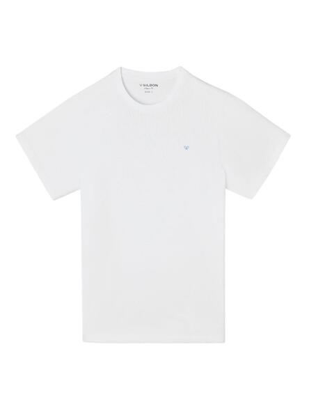 Camiseta Silbon. Modelo con Logo circular en la espalda. Color blanco. Cuello redondo. Manga corta. Logo minimalista en el pecho. Logo estampado en la espalda con detalles étnicos. Color azul y amarillo.