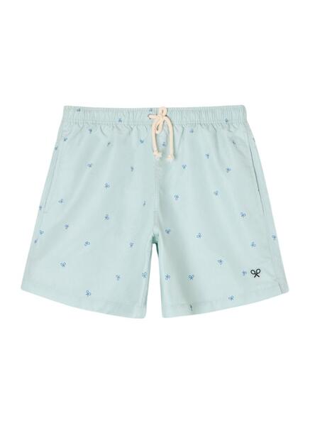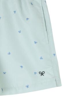 Bañador Silbon. Modelo Miniraquetas. Color turquesa. Estampado monográfico en contraste. Logo bordado en el bajo. Cintura elástica con cordón. Bolsillos laterales. Largo regular. Bolsillo trasero con parche de la marca.