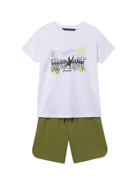 Conjunto Mayoral. Camiseta color blanco. Manga corta. Cuello redondo. Estampado en el pecho. Bermuda color verde. Bolsillos laterales. Cintura de goma con cordones.