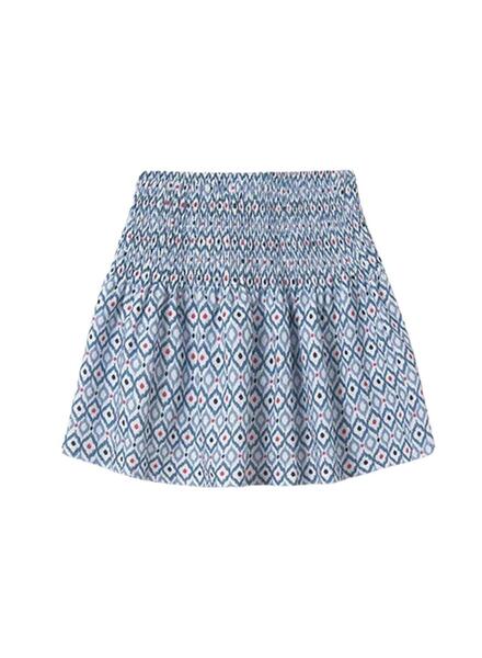 Falda Mayoral. Color azul. Estampada. Cintura de goma ancha. Formato corto.