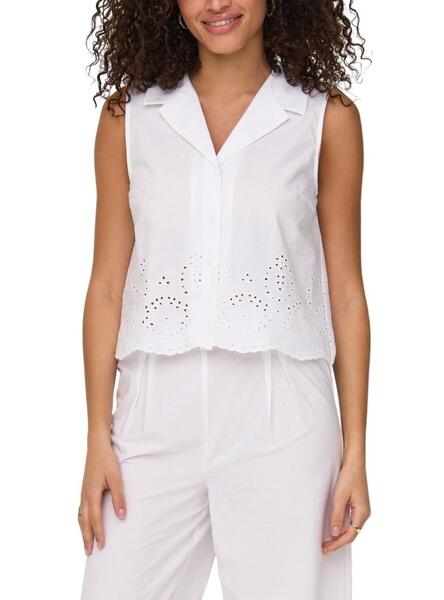Camisa Only. Color blanco. Sin mangas. Cuello resort. Cierre delantero con botones. Bordado inglés. Bajo ondulado. Corte regular. La modelo lleva la talla S.