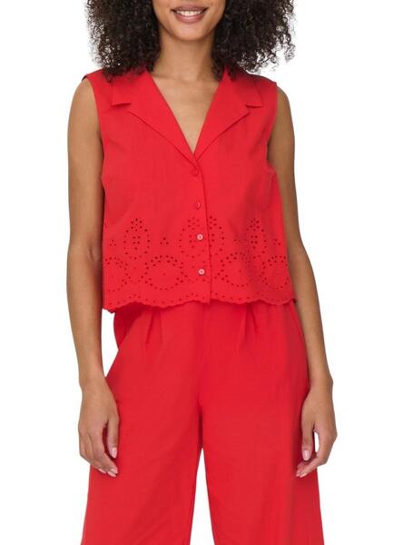 Camisa Only. Color rojo. Sin mangas. Cuello resort. Cierre delantero con botones. Bordado inglés. Bajo ondulado. Formato regular. La modelo lleva la talla S.