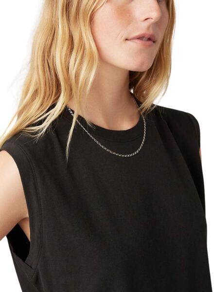 Camiseta Levis. Modelo Boxy. Color negro. Cuello redondo. Sin mangas. Corte recto. Etiqueta lateral de la marca en color rojo. La modelo lleva la talla S.