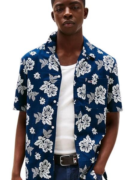 Camisa Tommy Jeans. Modelo Hawaii. Color azul marino. Cuello camisero. Estampado tropical. Bolsillo de parche en el pecho con logo bordado. Manga corta. Cierre con botones.