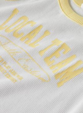 Camiseta Name It. Modelo Hasinna. Color blanco y amarillo. Cuello redondo elástico. Estampado 'Local Team' en el pecho. Tejido elástico ajustado al cuerpo.