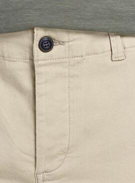 Bermudas Jack And Jones. Modelo Dave. Color beige. Bolsillos de vivo traseros. Bolsillos laterales. Estilo chino. Etiqueta trasera de la marca. Trabillas para cinturón. Pierna con vuelta. Cierre con botón y cremallera. Regular.